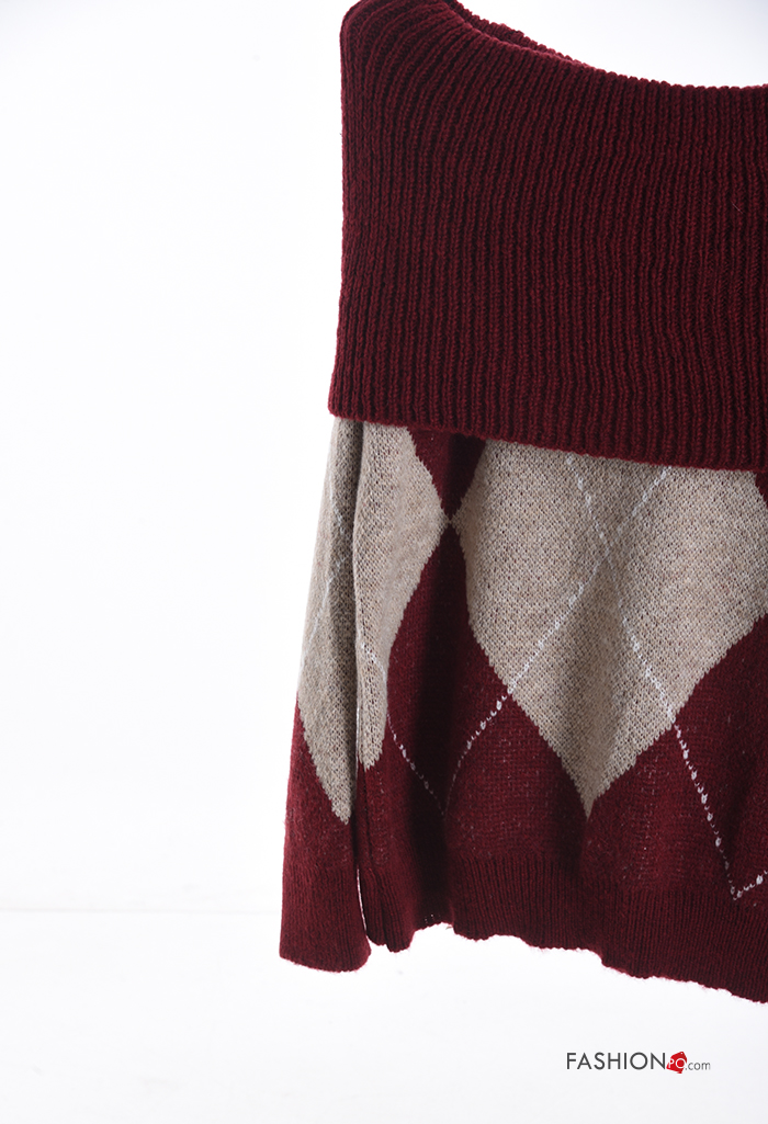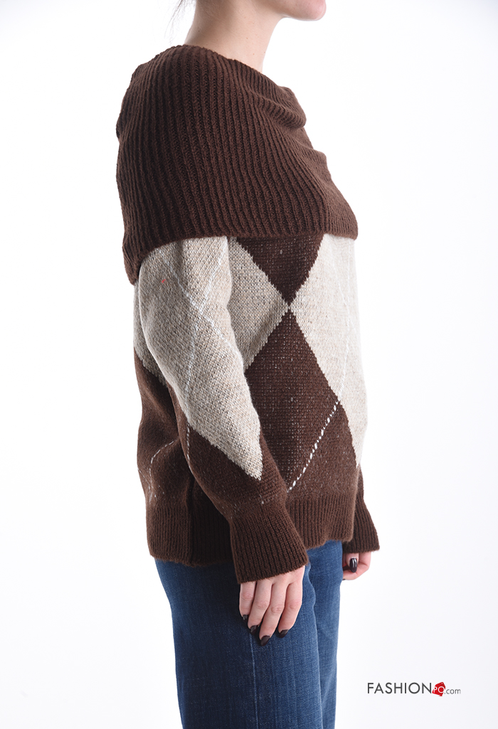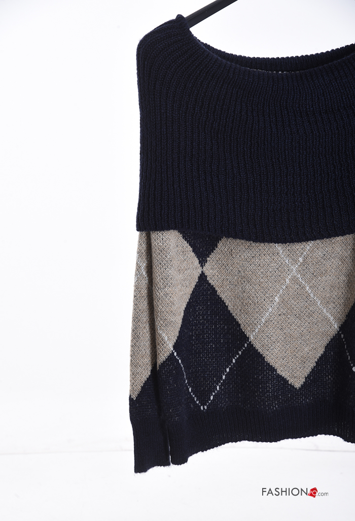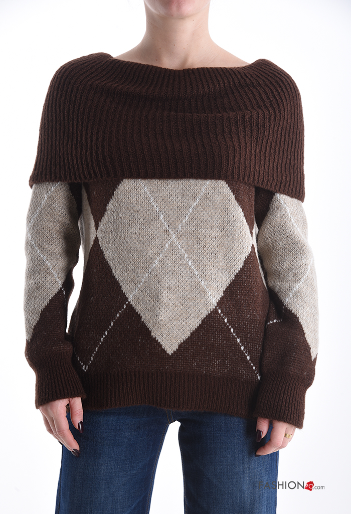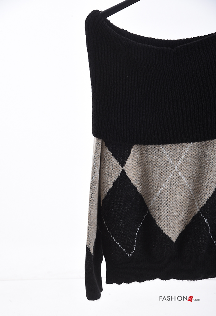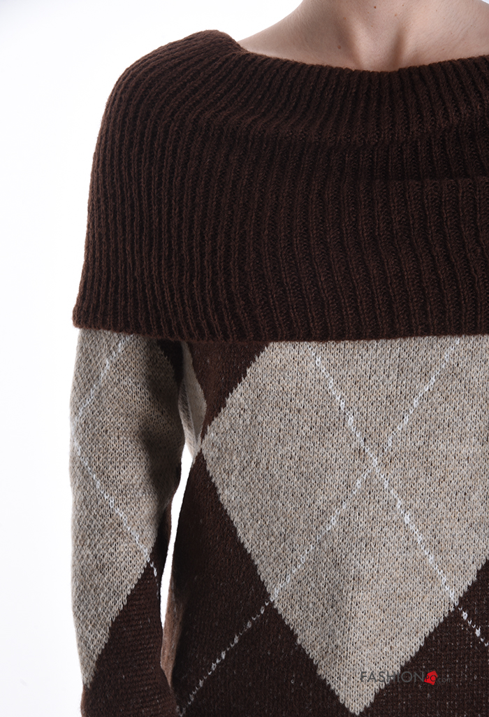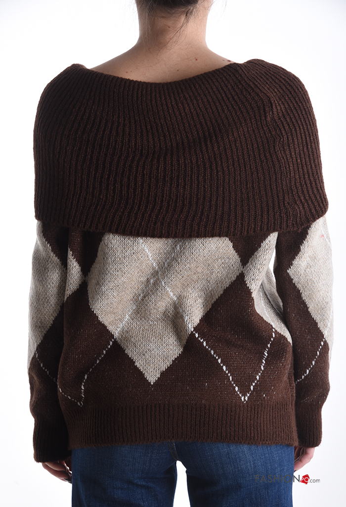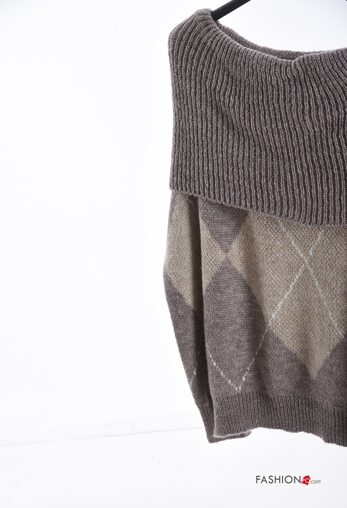 Geometric pattern long sleeve Mohair Sweater bardot neckline