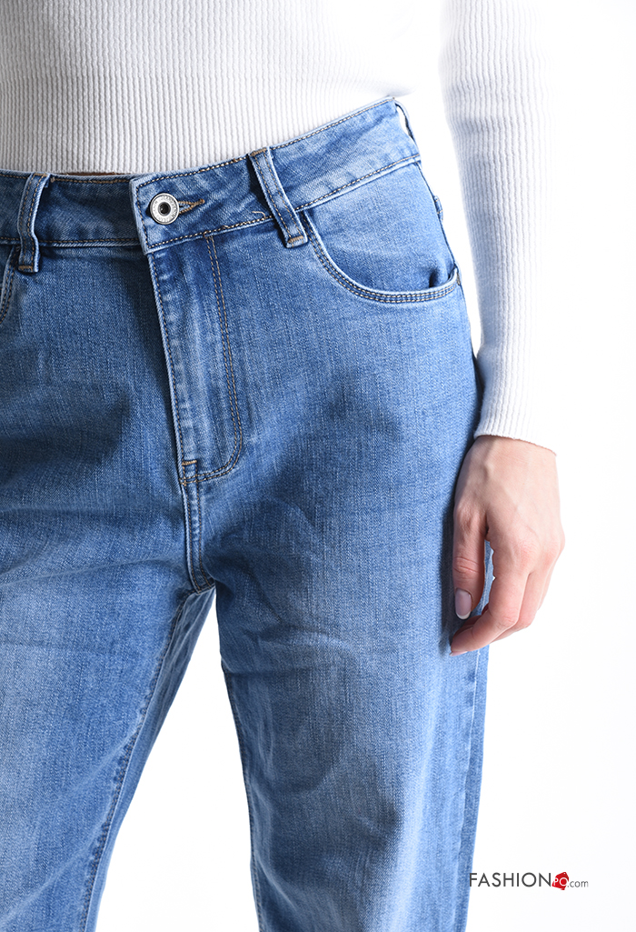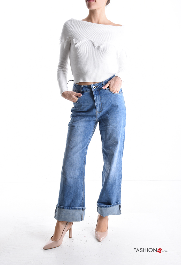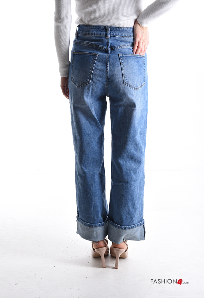 denim wide leg Cotton Jeans with buttons with zip with pockets