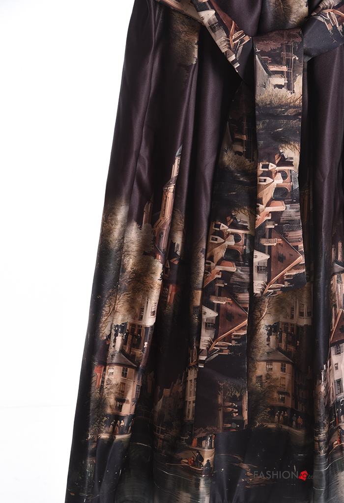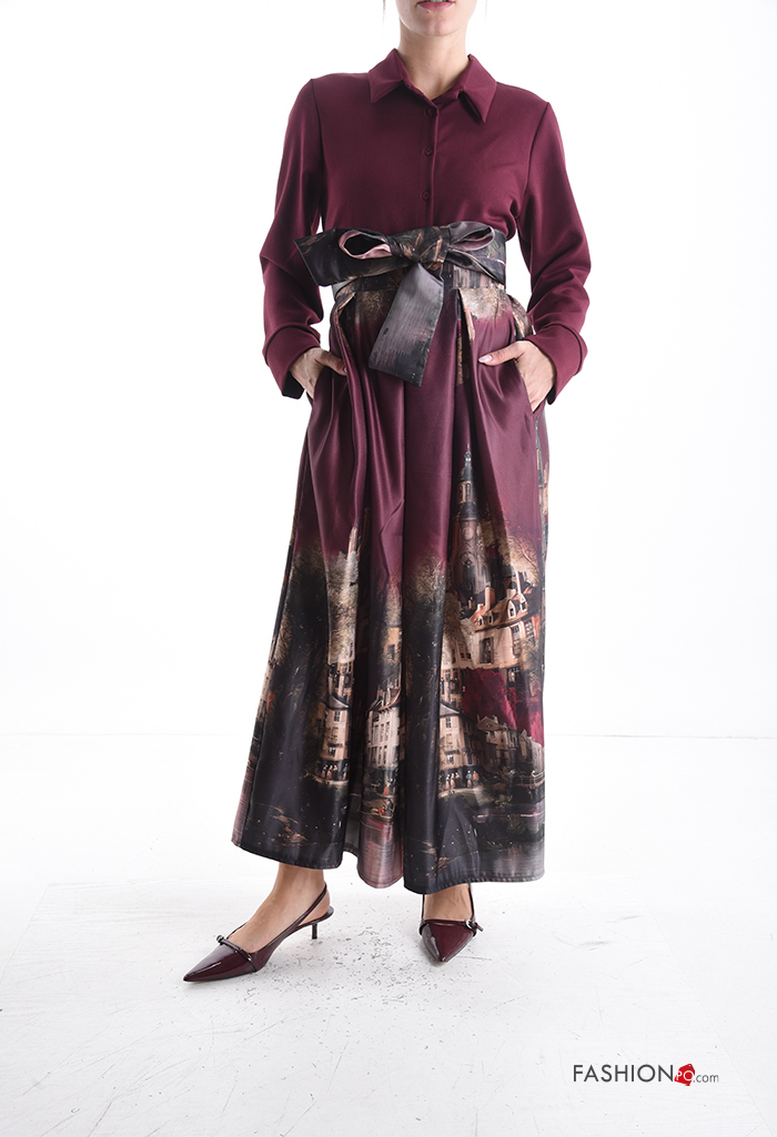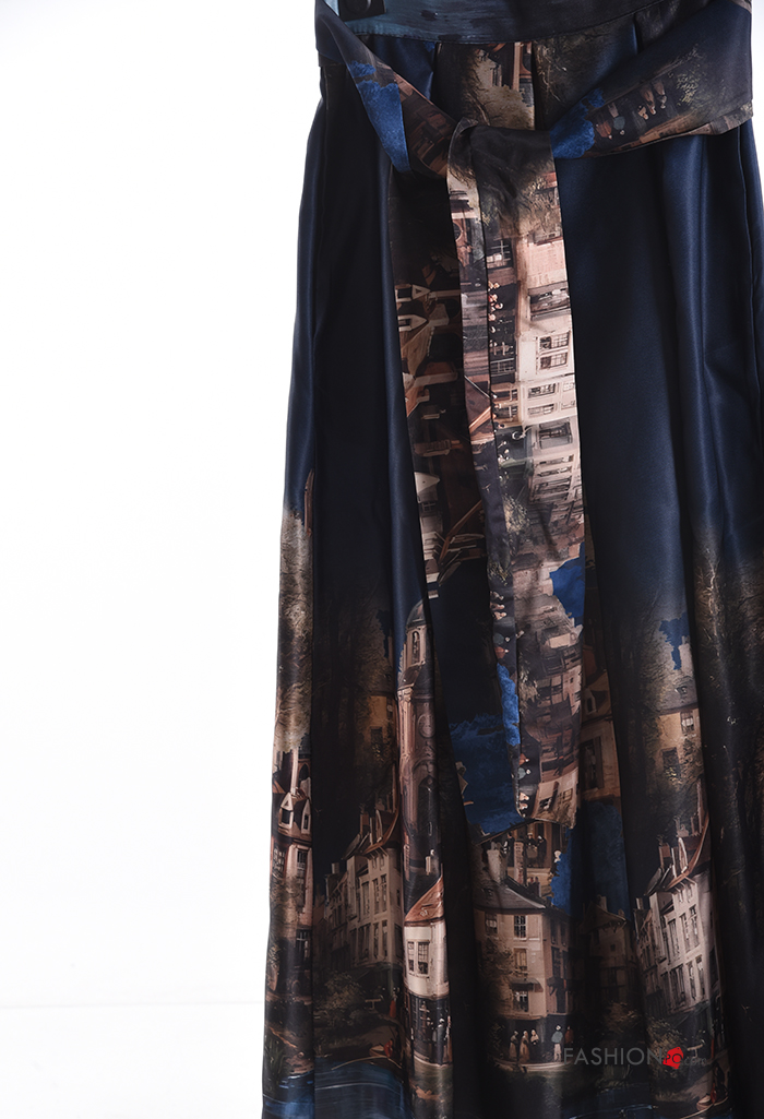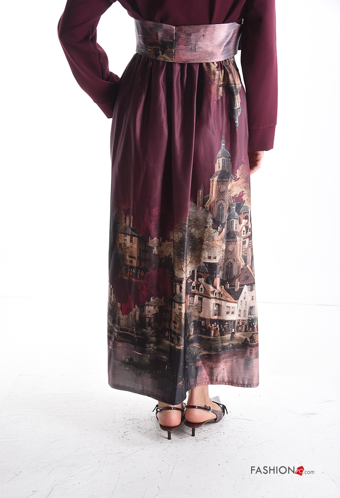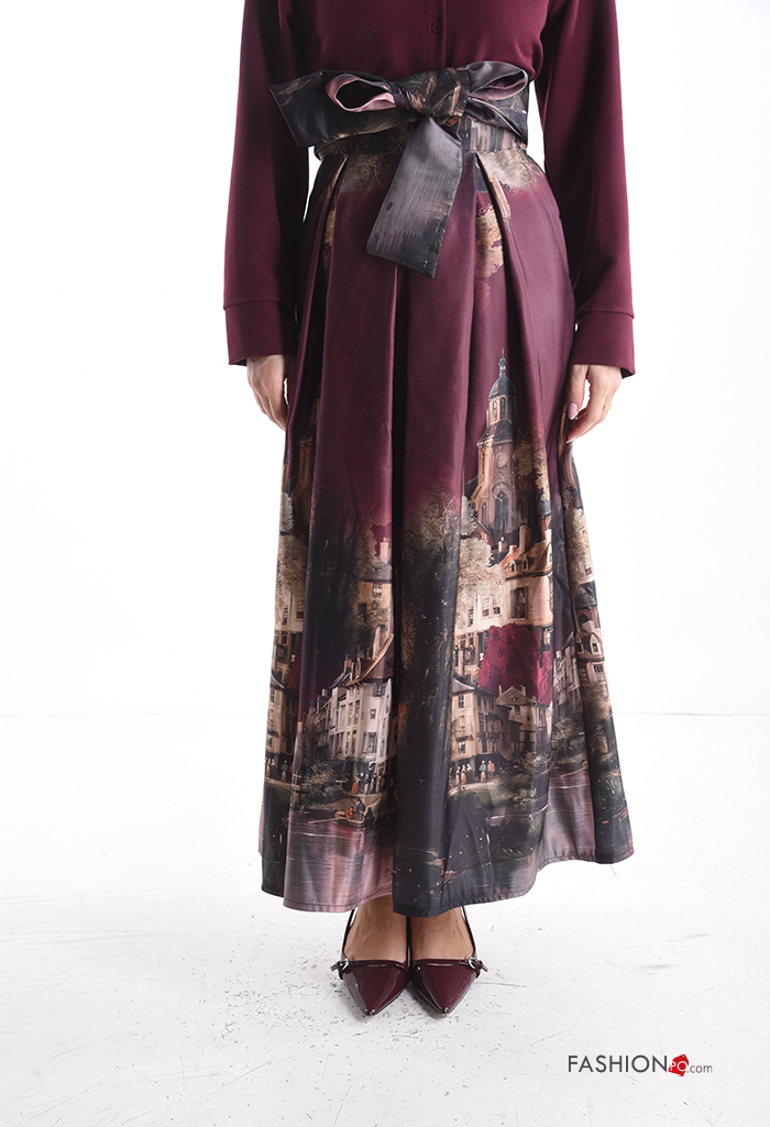 Home > Clothing > Skirts > Places and countries print satin high waist Skirt with fabric belt