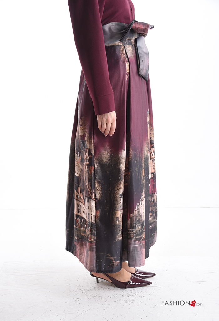 Places and countries print satin high waist Skirt with fabric belt