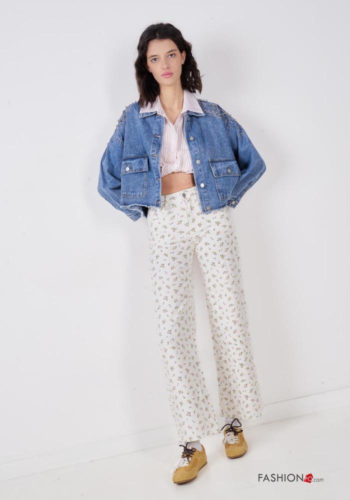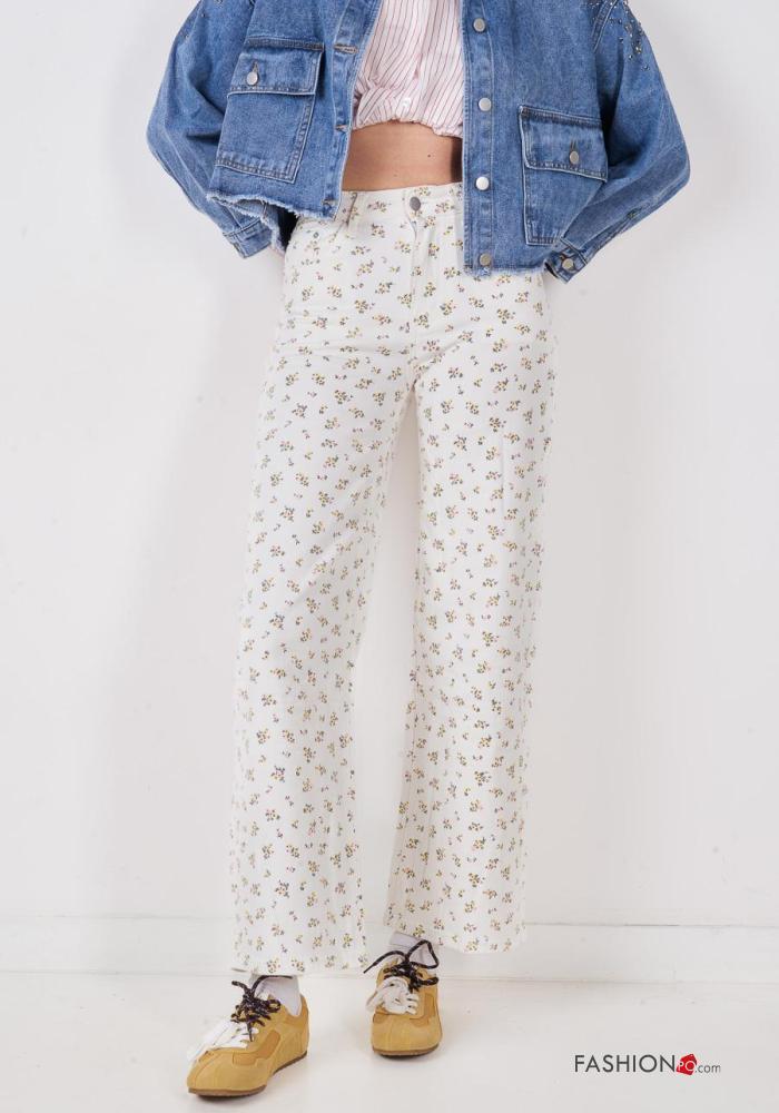 Jeans in Cotone Fantasia floreale con tasche con bottoni con zip