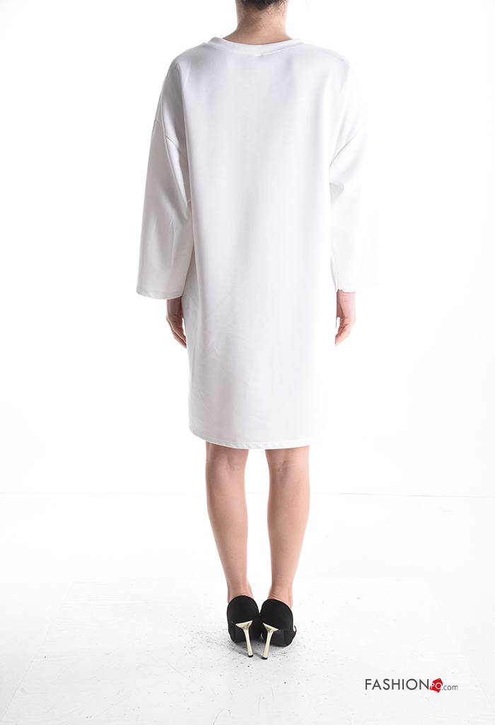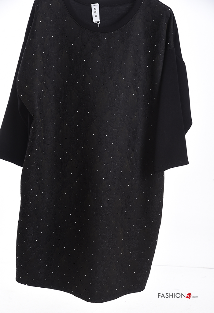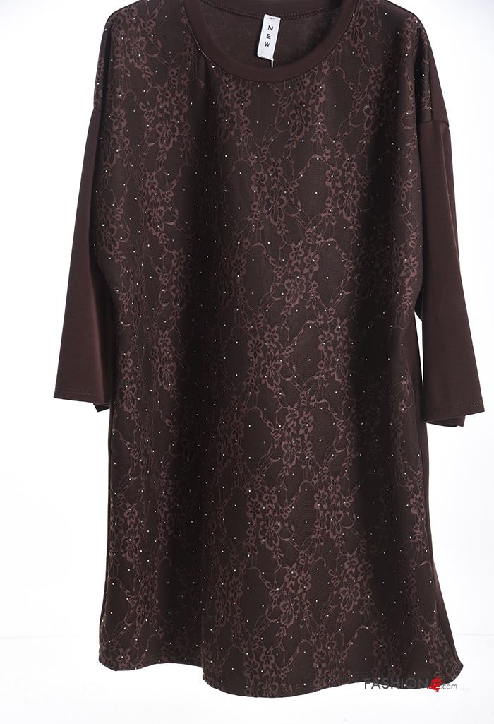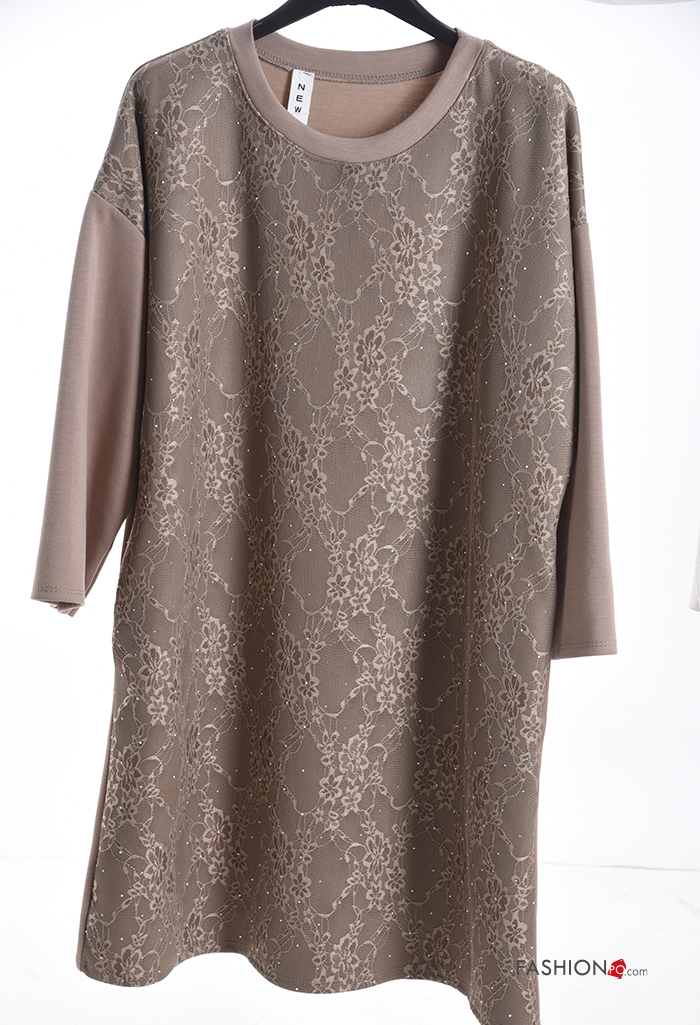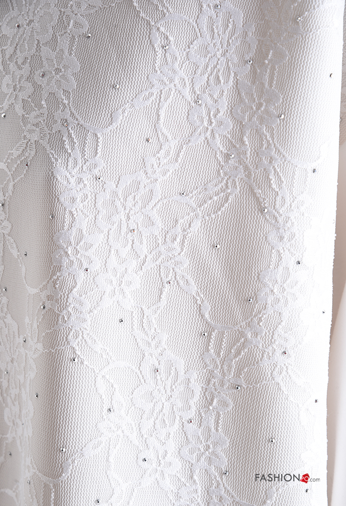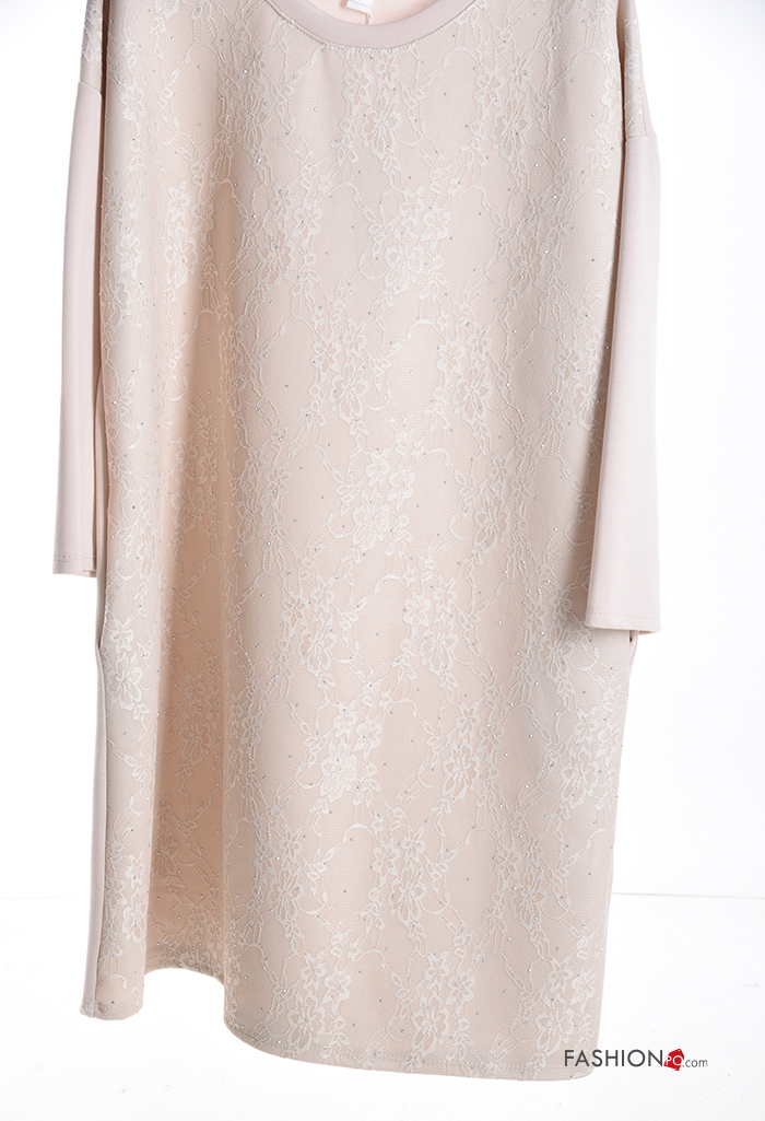 Abito girocollo al ginocchio pizzo maniche lunghe Fantasia ricamata con strass
