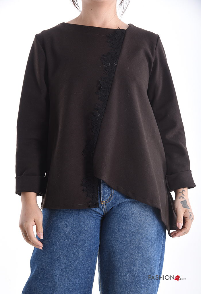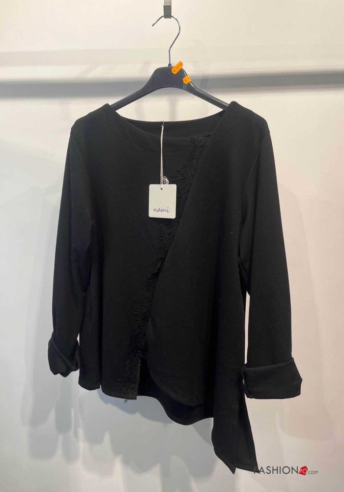 Maglietta a manica lunga girocollo asimmetrico pizzo maniche lunghe