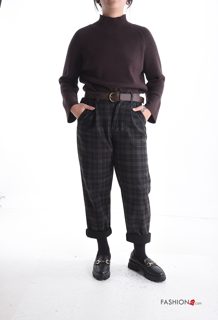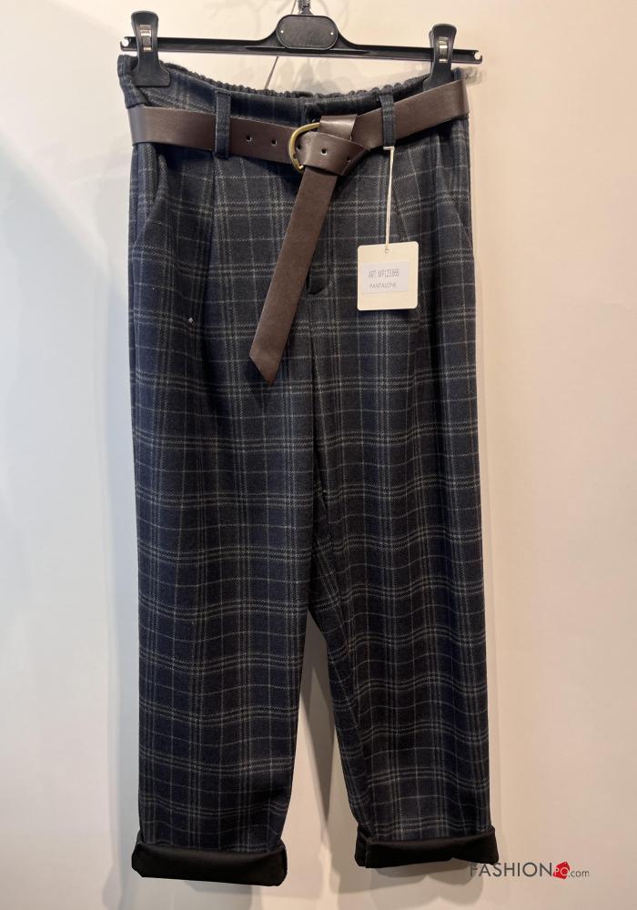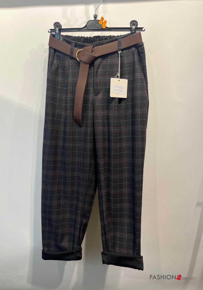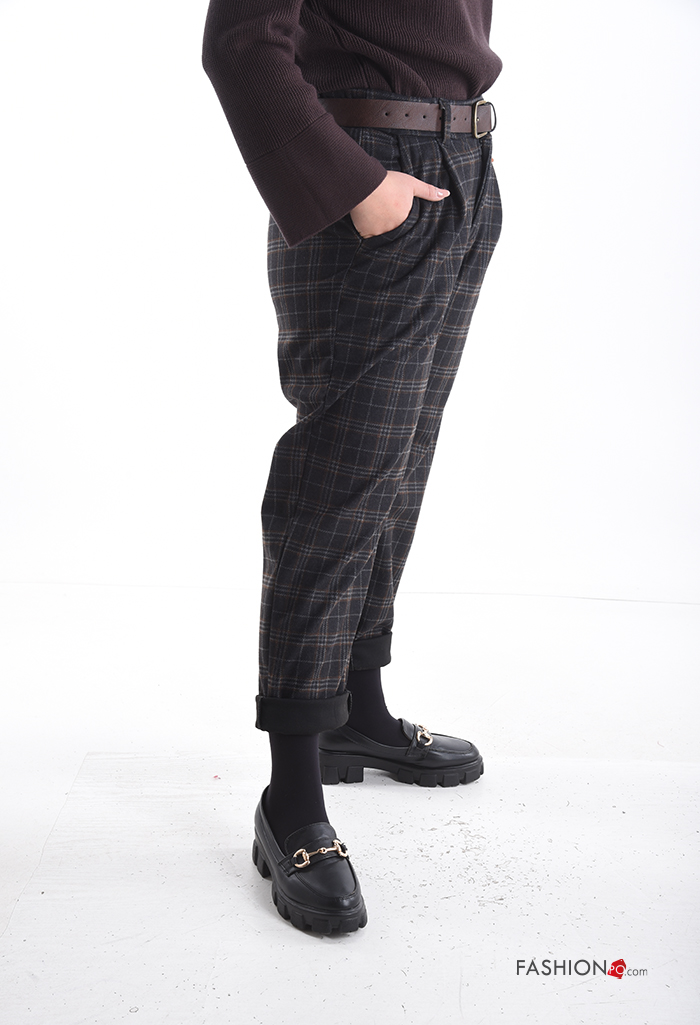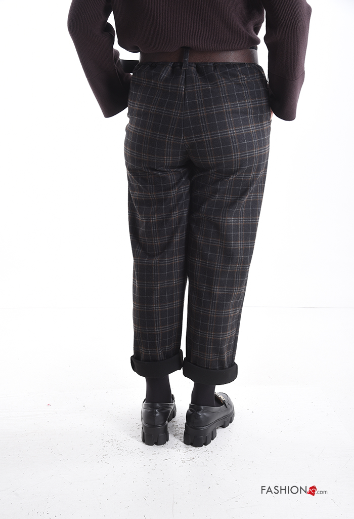 Calças Padrão Tartan com bolsos com botões com cinto com fecho