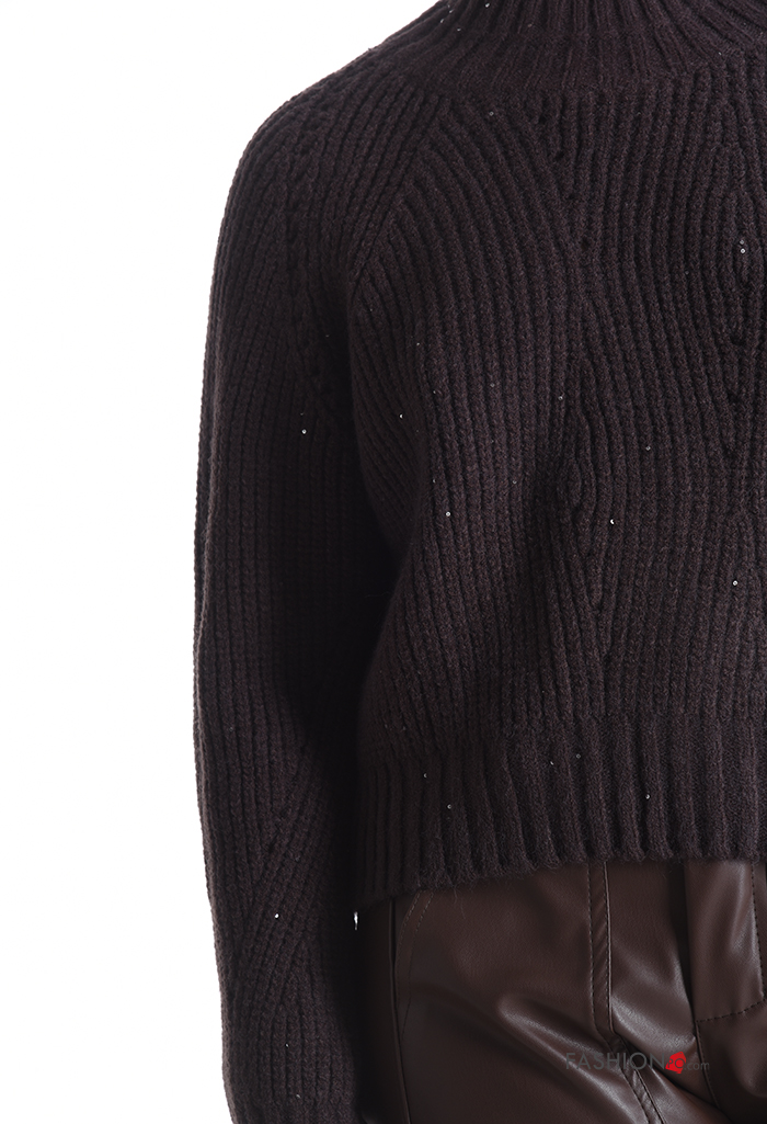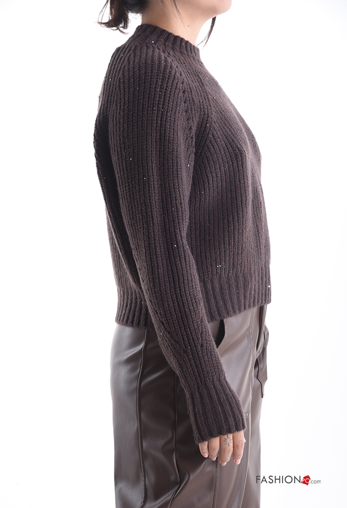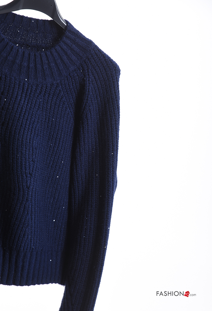 Camisola manga comprida em jersey canelado gola redonda com lantejoulas